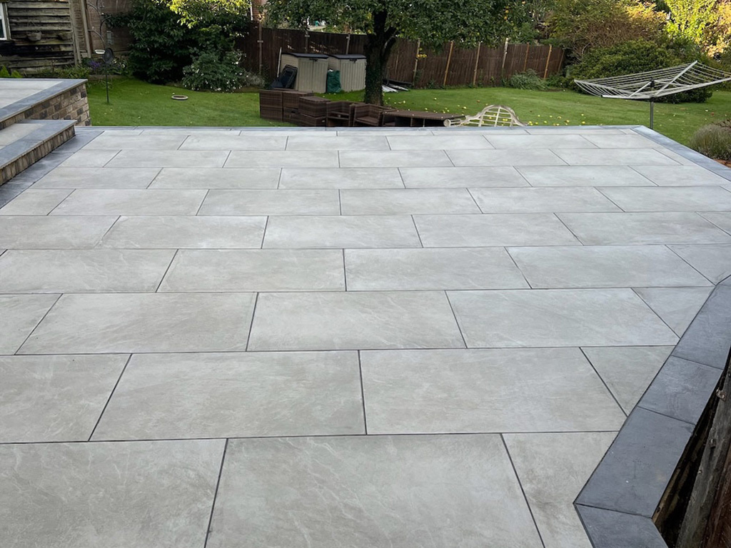 This project involved a complete garden redesign featuring a porcelain patio with a contrasting border and extensive brickwork detailing to manage large changes in level.