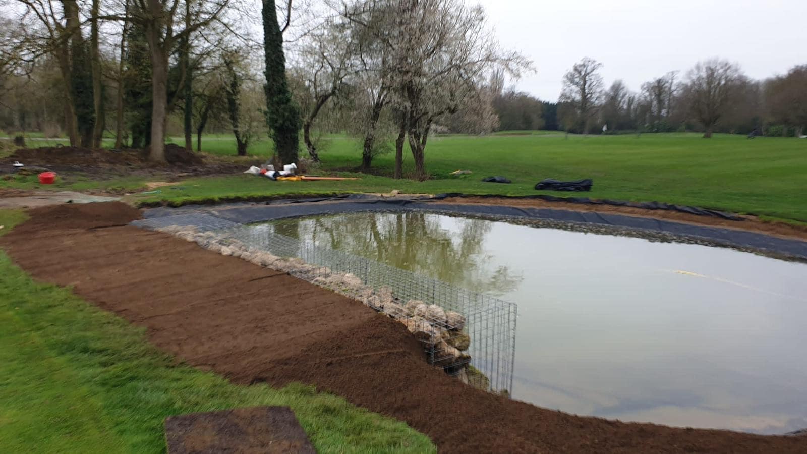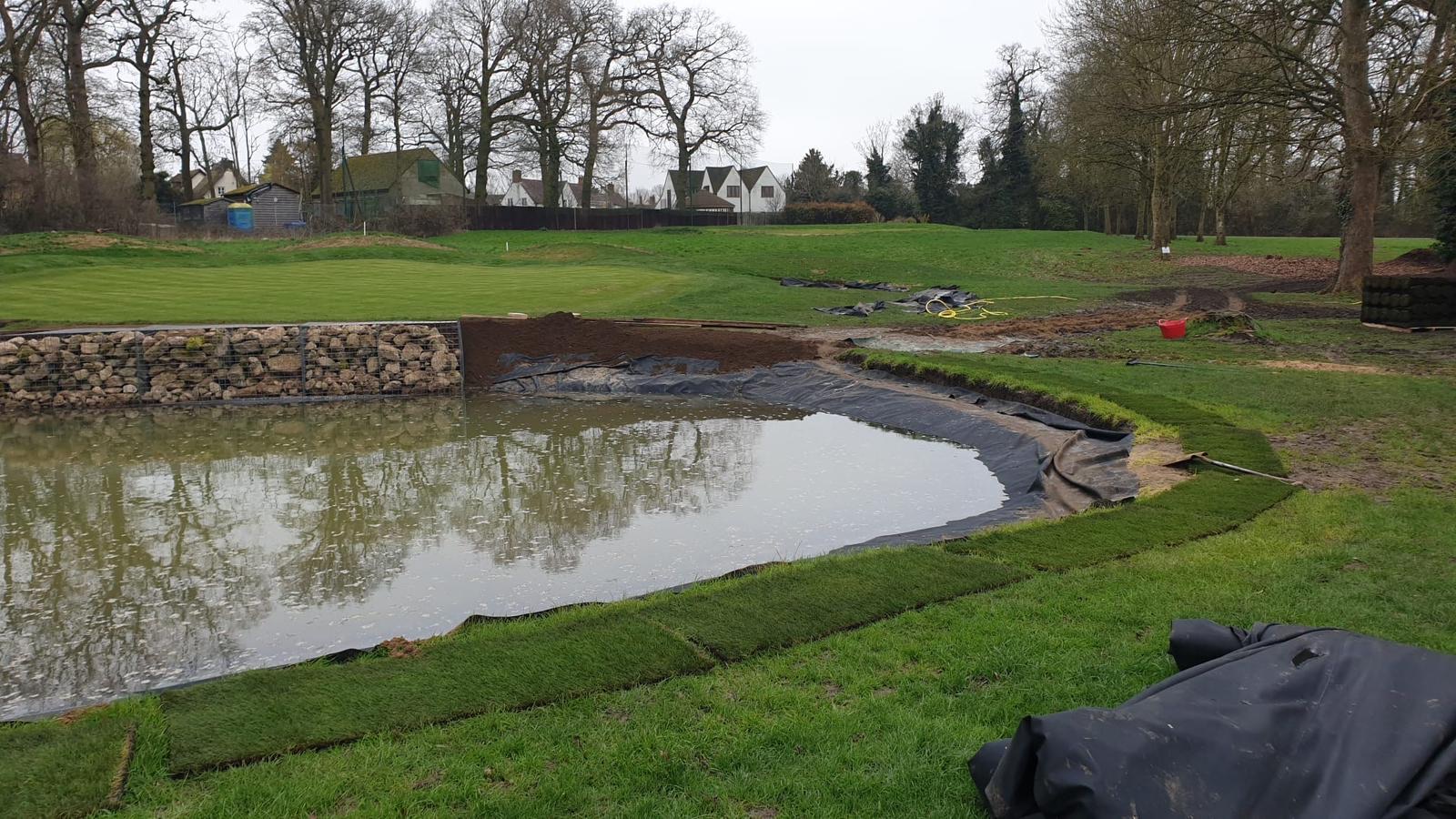 The pond was excavated, shaped, and lined before being finished with gabion retaining baskets and newly graded surrounds, enhancing both visual appeal and course playability.